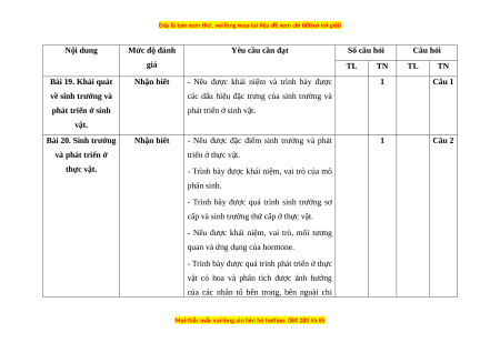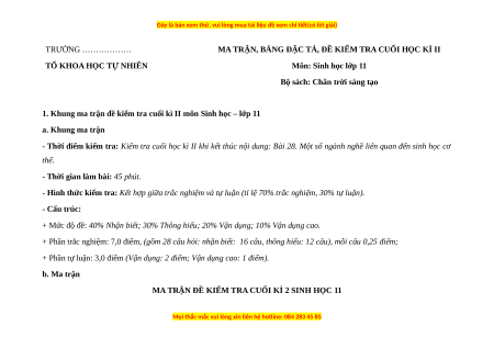 1. Khung ma trận đề kiểm tra cuối kì II môn Sinh học – lớp 11 a. Khung ma trận