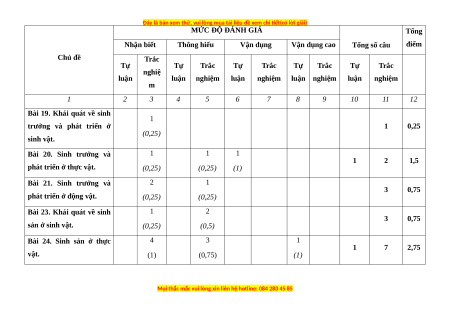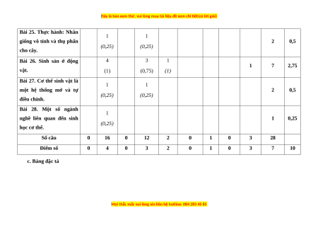 nghề liên quan đến sinh 1 0,25 (0,25) học cơ thể. Số câu 0 16 0 12 2 0 1 0 3 28 Điểm số 0 4 0 3 2 0 1 0 3 7 10 c. Bảng đặc tả