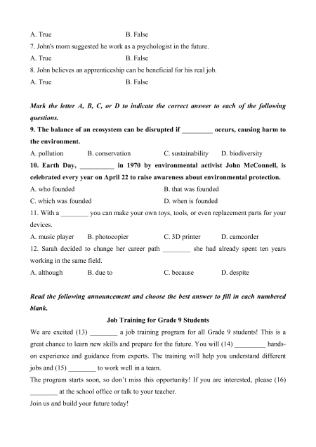 We are excited (13) ________ a job training program for all Grade 9 students! This is a