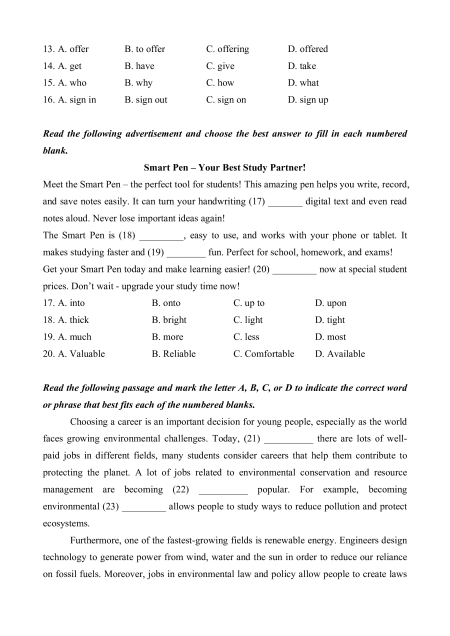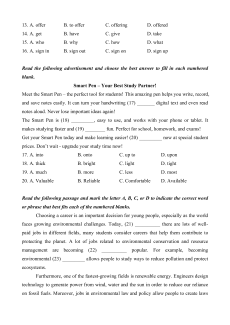 prices. Don’t wait - upgrade your study time now! 17. A. into B. onto C. up to D. upon 18. A. thick B. bright C. light D. tight 19. A. much B. more C. less D. most 20. A. Valuable B. Reliable C. Comfortable D. Available