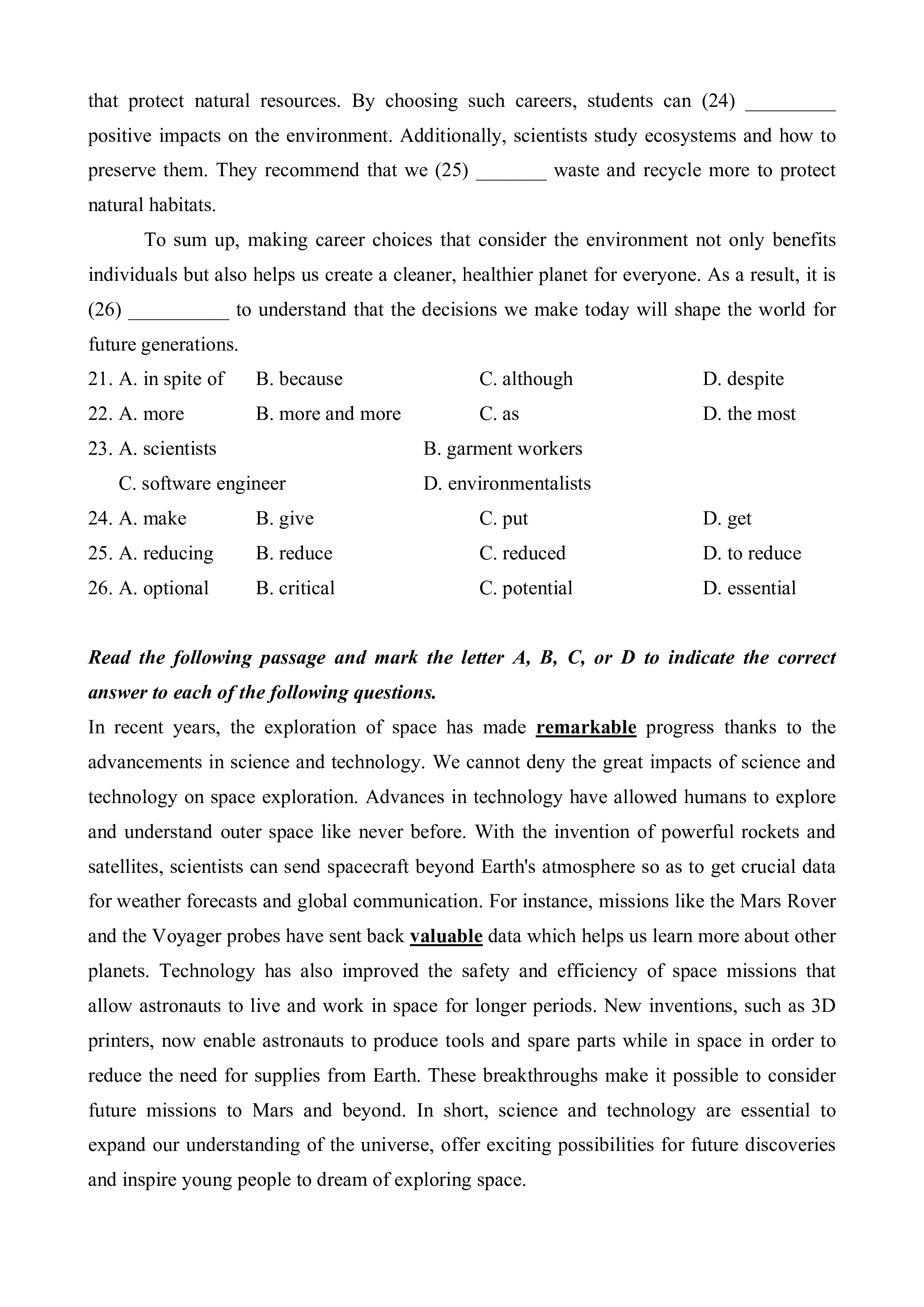 (26) __________ to understand that the decisions we make today will shape the world for future generations. 21. A. in spite of B. because C. although D. despite 22. A. more B. more and more C. as D. the most 23. A. scientists B. garment workers C. software engineer D. environmentalists 24. A. make B. give C. put D. get 25. A. reducing B. reduce C. reduced D. to reduce 26. A. optional B. critical C. potential D. essential