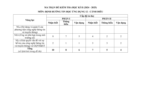 MÔN: ĐỊNH HƯỚNG TIN HỌC ỨNG DỤNG 12 - CÁNH DIỀU Cấp độ tư duy Năng lực PHẦN I PHẦN II Nhận biết Thông hiểu Vận dụng Nhận biết Thông hiểu Vận dụng
