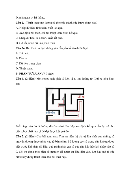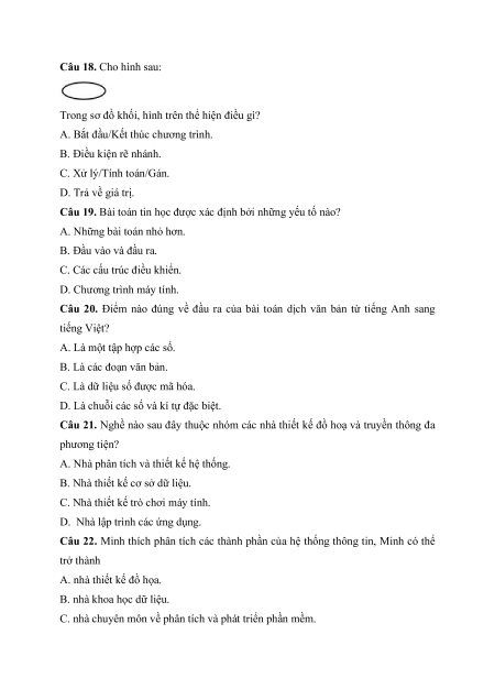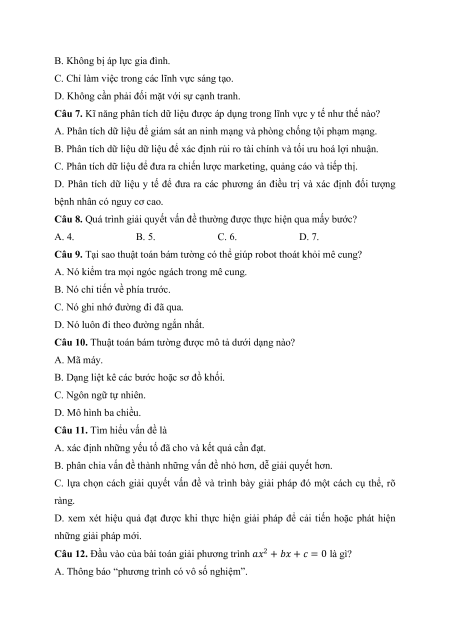 Câu 8. Quá trình giải quyết vấn đề thường được thực hiện qua mấy bước? A. 4. B. 5. C. 6. D. 7.