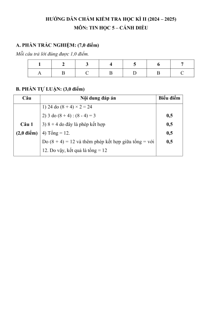 HƯỚNG DẪN CHẤM KIỂM TRA HỌC KÌ II (2024 – 2025)