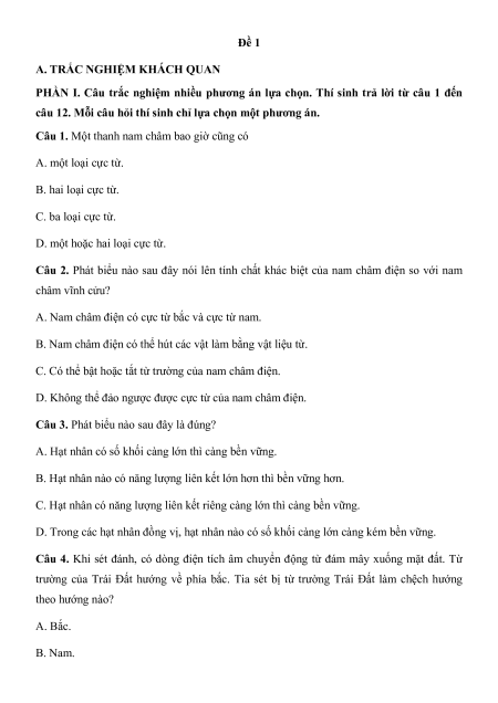 Câu 1. Một thanh nam châm bao giờ cũng có A. một loại cực từ. B. hai loại cực từ. C. ba loại cực từ.
