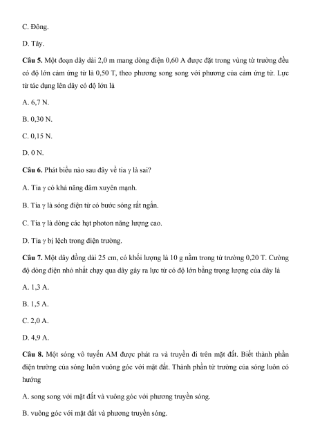 Câu 5. Một đoạn dây dài 2,0 m mang dòng điện 0,60 A được đặt trong vùng từ trường đều