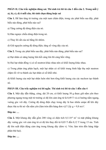 PHẦN I. Câu trắc nghiệm nhiều phương án lựa chọn. Thí sinh trả lời từ câu 1 đến