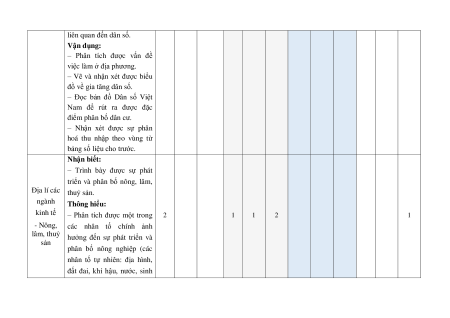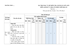 Trắc nghiệm khách quan Nội dung Tự luận Nhiều lựa chọn Đúng - sai Trả lời ngắn kiến thức Vận Biế Vận Vận Hiể Vận Vận Biết Hiểu Hiểu Biết Hiểu Biết Biết Hiểu dụng t dụng dụng u dụng dụng Địa lí dân cư 2 2 1 2 1 1 3 5 1 30% Việt Nam Địa lí các ngành kinh tế 2 2 1 1 1 4 1 2 20% - Nông, lâm, thuỷ sản Tổng số câu/ 4 2 2 1 1 1 2 1 1 1 7 5 3 16 lệnh hỏi Tổng số điểm 1,5 1,0 1,0 1,5 1,75 2,25 1,0 5,0 17,5 22,5 10 50% Tỉ lệ % 15% 10% 10% 15% % % % TRƯỜNG THCS ….