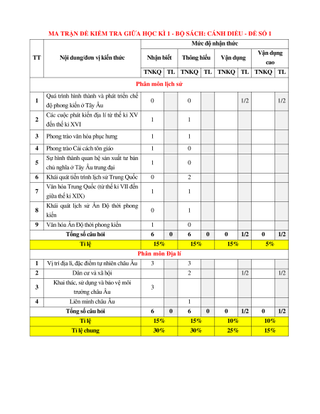 MA TRẬN ĐỀ KIỂM TRA GIỮA HỌC KÌ 1 - BỘ SÁCH: CÁNH DIỀU - ĐỀ SỐ 1