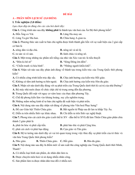 A - PHÂN MÔN LỊCH SỬ (5,0 ĐIỂM)