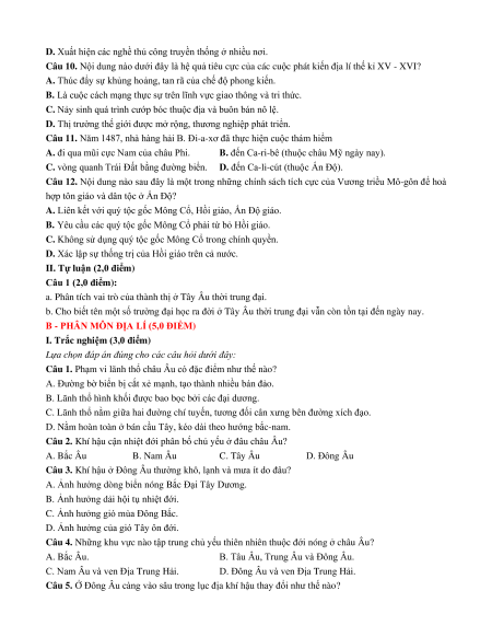Câu 2. Khí hậu cận nhiệt đới phân bố chủ yếu ở đâu châu Âu? A. Bắc Âu B. Nam Âu C. Tây Âu D. Đông Âu