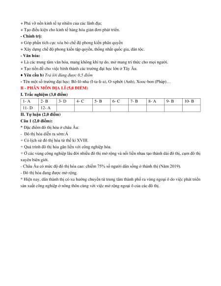 Câu 1 (2,0 điểm): Trình bày đặc điểm đô thị hóa ở châu Âu. Hiện nay, dân thành thị có xu hướng chuyển