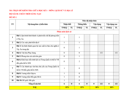 Bài 10. Đế quốc Mô-gôn 1 0 Tổng số câu hỏi 6 0 6 0 0 1/2 0 1/2 Tỉ lệ 15% 15% 10% 10% Phân môn Địa lí 1 Thiên nhiên châu Âu 3 3 2