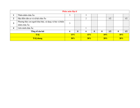 Phương thức con người khai thác, sử dụng và bảo vệ thiên 3 3 nhiên châu Âu 4 Liên minh châu Âu 1 Tổng số câu hỏi 6 0 6 0 0 1/2 0 1/2 Tỉ lệ 15% 15% 10% 10% Tỉ lệ chung 30% 30% 20% 20% ĐỀ BÀI
