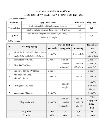 Dân cư và dân tộc ở Việt Nam 2 câu TN 3 câu TN Nhà nước Văn Lang, 5 1 câu TN 1 câu TN 2 câu TN Nhà nước Âu Lạc 1 câu TN 1 câu điền 6 Vương quốc Phù Nam 1 câu điền khuyết khuyết 7 Vương quốc Chăm-pa 2 câu TN 2 câu TN 10 TN 1 câu TN 1 câu TN 1 dạng Đ-S Tổng số câu hỏi 8 câu TN 2 lệnh hỏi 2 lệnh hỏi 1 điền. 1 câu điền… 1 câu TL 1 TL Tỉ lệ điểm 4,0 3,0 3,0 10 Tỉ lệ % 40% 30% 30% 100%