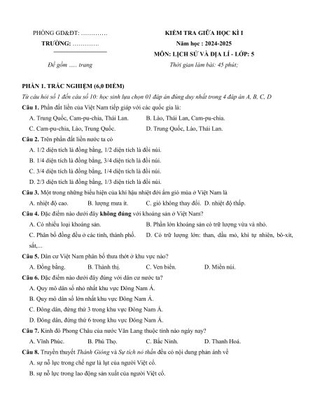 MÔN: LỊCH SỬ VÀ ĐỊA LÍ – LỚP: 5 – NĂM HỌC: 2024 – 2025