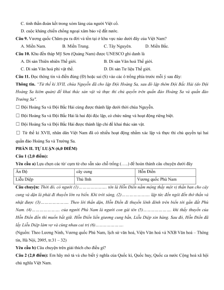 Câu 9. Vương quốc Chăm-pa ra đời và tồn tại ở khu vực nào dưới đây của Việt Nam? A. Miền Nam. B. Miền Trung. C. Tây Nguyên. D. Miền Bắc.