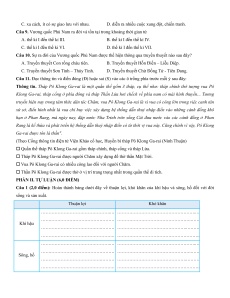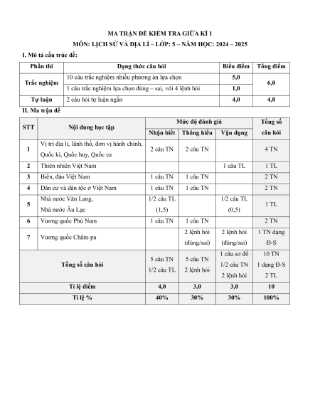 Dân cư và dân tộc ở Việt Nam 1 câu TN 1 câu TN 2 TN Nhà nước Văn Lang, 1/2 câu TL 1/2 câu TL 5 1 TL Nhà nước Âu Lạc (1,5) (0,5) 6 Vương quốc Phù Nam 1 câu TN 1 câu TN 2 TN 2 lệnh hỏi 2 lệnh hỏi 1 TN dạng 7 Vương quốc Chăm-pa (đúng/sai) (đúng/sai) Đ-S 1 câu sơ đồ 10 TN 5 câu TN 5 câu TN Tổng số câu hỏi 1/2 câu TN 1 dạng Đ-S 1/2 câu TL 2 lệnh hỏi 2 lệnh hỏi 2 TL Tỉ lệ điểm 4,0 3,0 3,0 10 Tỉ lệ % 40% 30% 30% 100%
