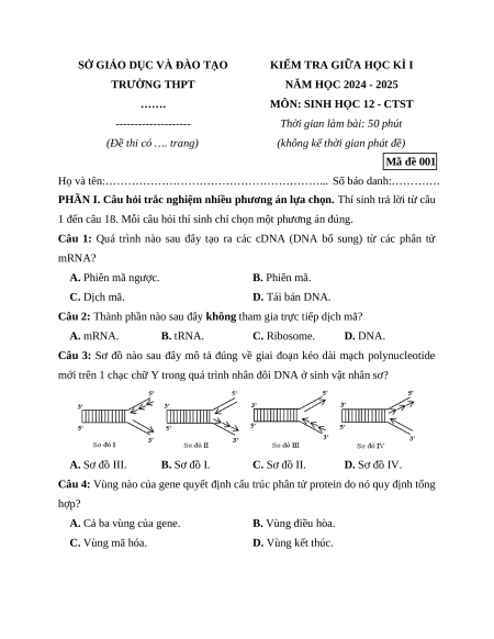Câu 1: Quá trình nào sau đây tạo ra các cDNA (DNA bổ sung) từ các phân tử mRNA? A. Phiên mã ngược. B. Phiên mã. C. Dịch mã. D. Tái bản DNA.