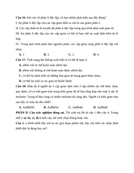 Câu 16: Khi nói về phân li độc lập, có bao nhiêu phát biểu sau đây đúng?