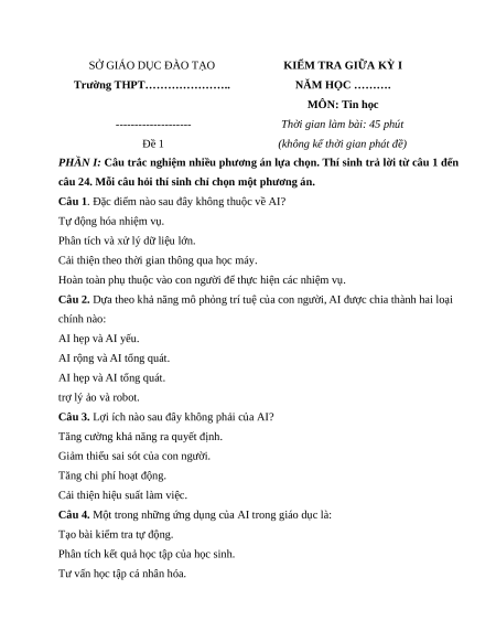 Bộ 3 đề thi giữa kì 1 Tin học 12 Chân trời sáng tạo có đáp án