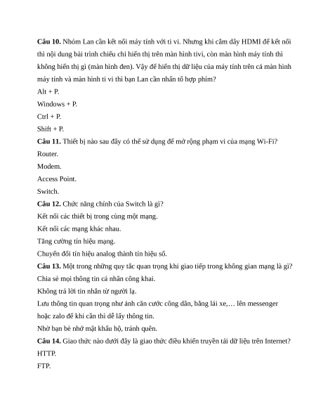 Câu 11. Thiết bị nào sau đây có thể sử dụng để mở rộng phạm vi của mạng Wi-Fi? Router. Modem. Access Point. Switch.