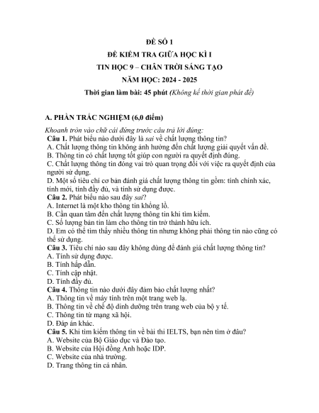 Bộ 3 đề thi giữa kì 1 Tin học 9 Chân trời sáng tạo có đáp án