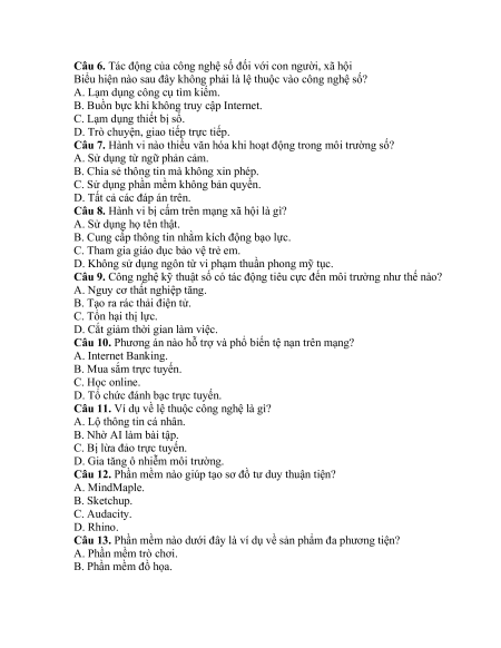 Câu 11. Ví dụ về lệ thuộc công nghệ là gì? A. Lộ thông tin cá nhân. B. Nhờ AI làm bài tập.