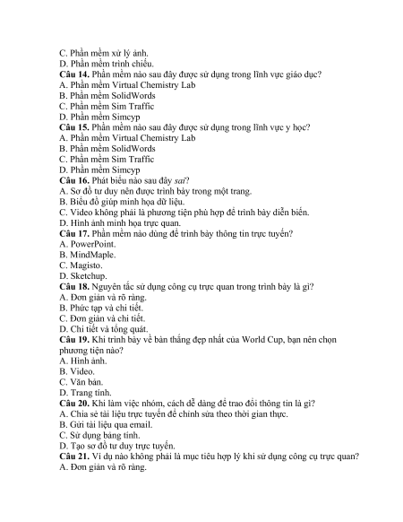 Câu 17. Phần mềm nào dùng để trình bày thông tin trực tuyến? A. PowerPoint. B. MindMaple. C. Magisto. D. Sketchup.