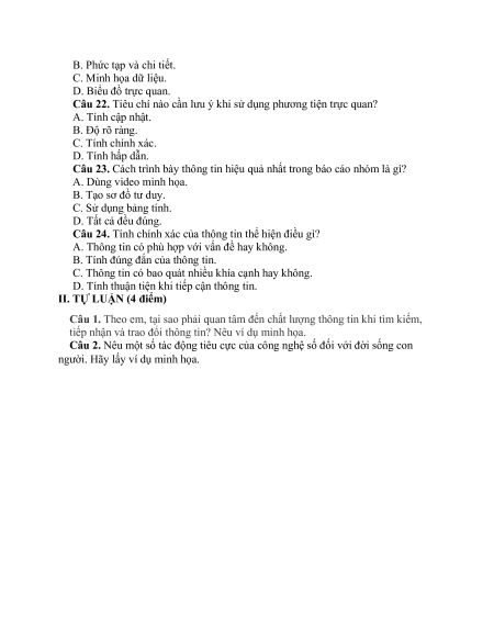 Câu 22. Tiêu chí nào cần lưu ý khi sử dụng phương tiện trực quan? A. Tính cập nhật. B. Độ rõ ràng. C. Tính chính xác. D. Tính hấp dẫn.