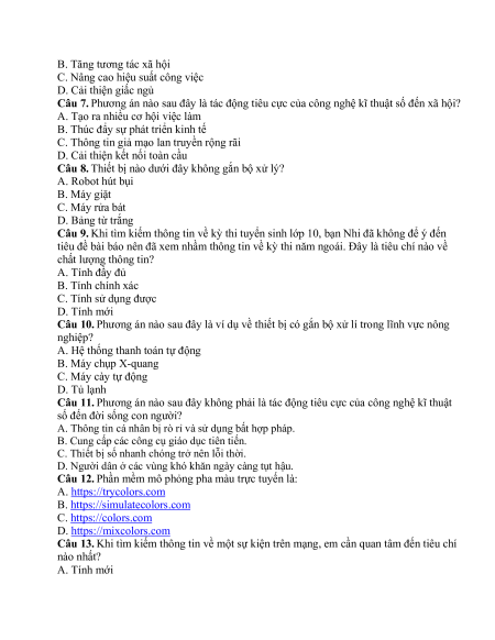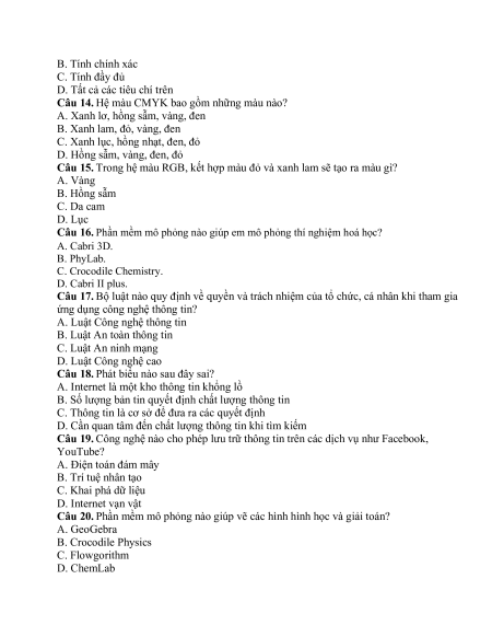 Câu 12. Phần mềm mô phỏng pha màu trực tuyến là: A. https://trycolors.com B. https://simulatecolors.com C. https://colors.com D. https://mixcolors.com