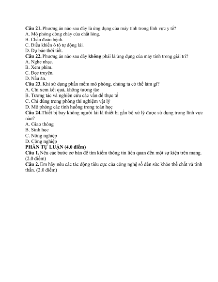 Câu 24.Thiết bị bay không người lái là thiết bị gắn bộ xử lý được sử dụng trong lĩnh vực nào? A. Giao thông B. Sinh học C. Nông nghiệp D. Công nghiệp