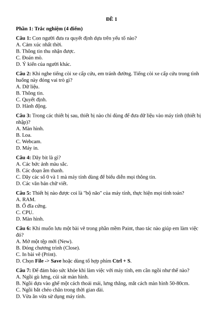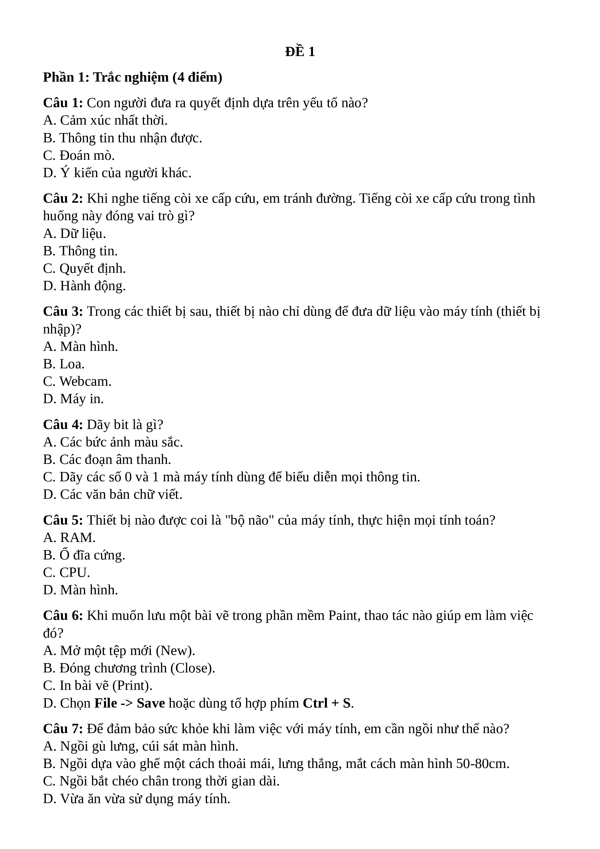 Câu 5: Thiết bị nào được coi là "bộ não" của máy tính, thực hiện mọi tính toán? A. RAM. B. Ổ đĩa cứng. C. CPU. D. Màn hình.
