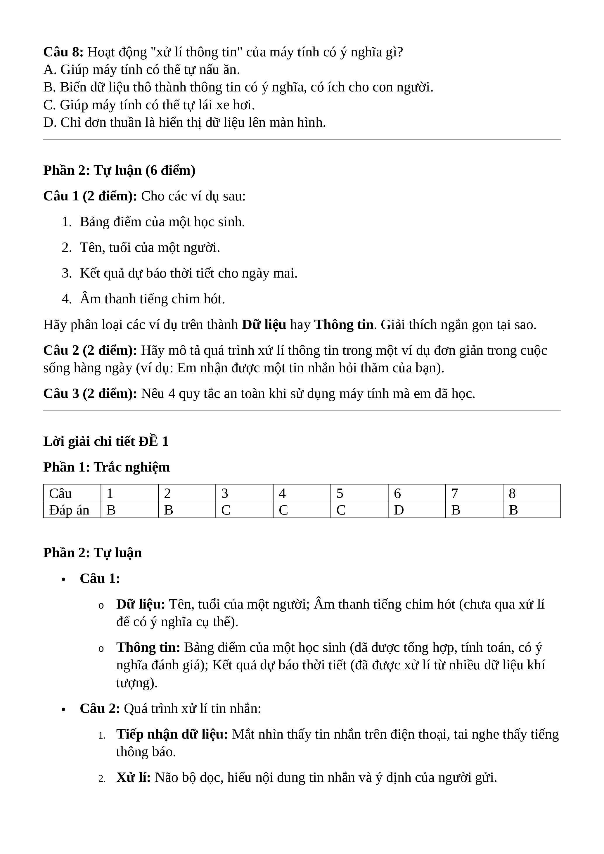 Phần 1: Trắc nghiệm Câu 1 2 3 4 5 6 7 8 Đáp án B B C C C D B B Phần 2: Tự luận Câu 1: o