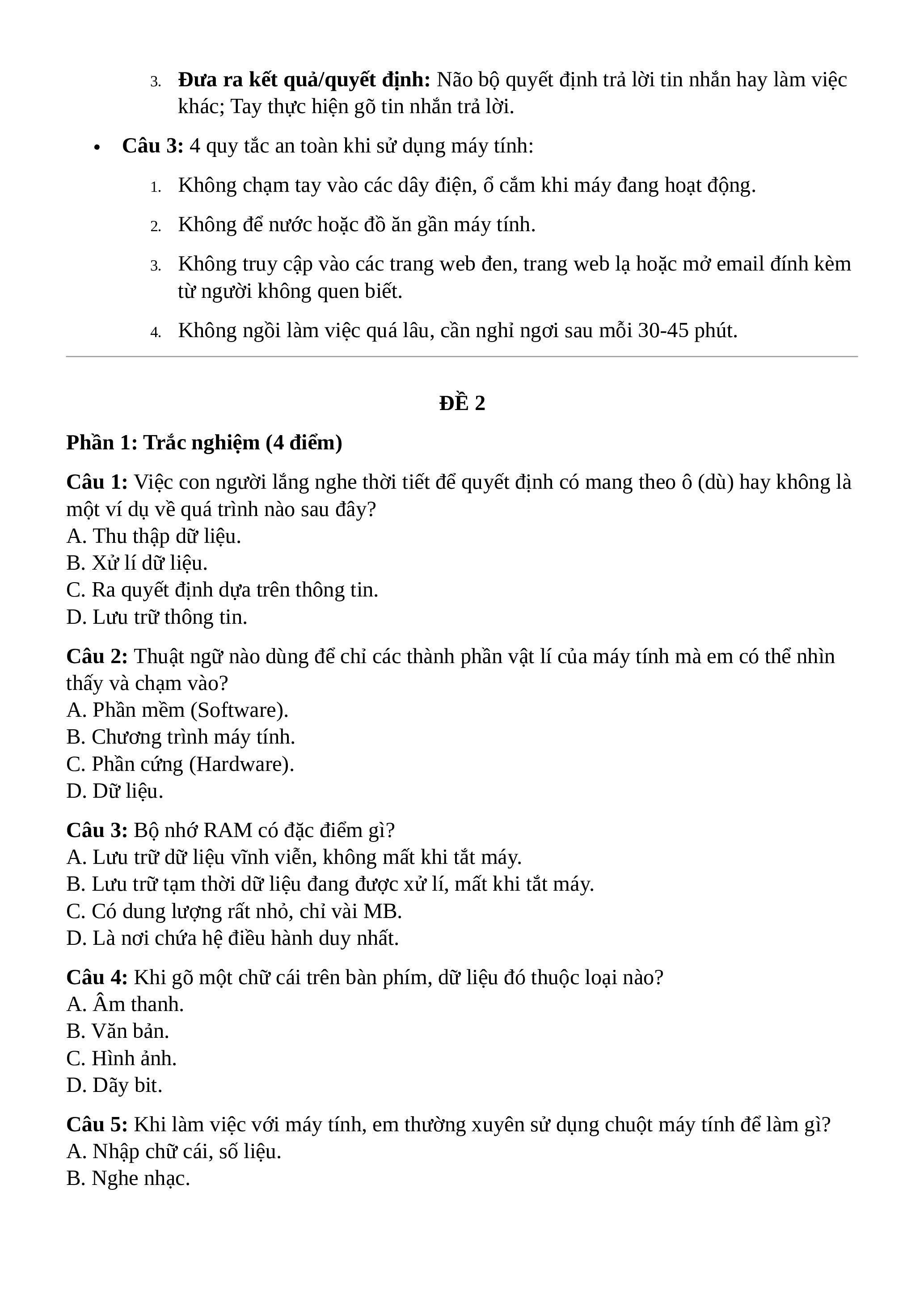Câu 3 (2 điểm): Nêu 4 quy tắc an toàn khi sử dụng máy tính mà em đã học.