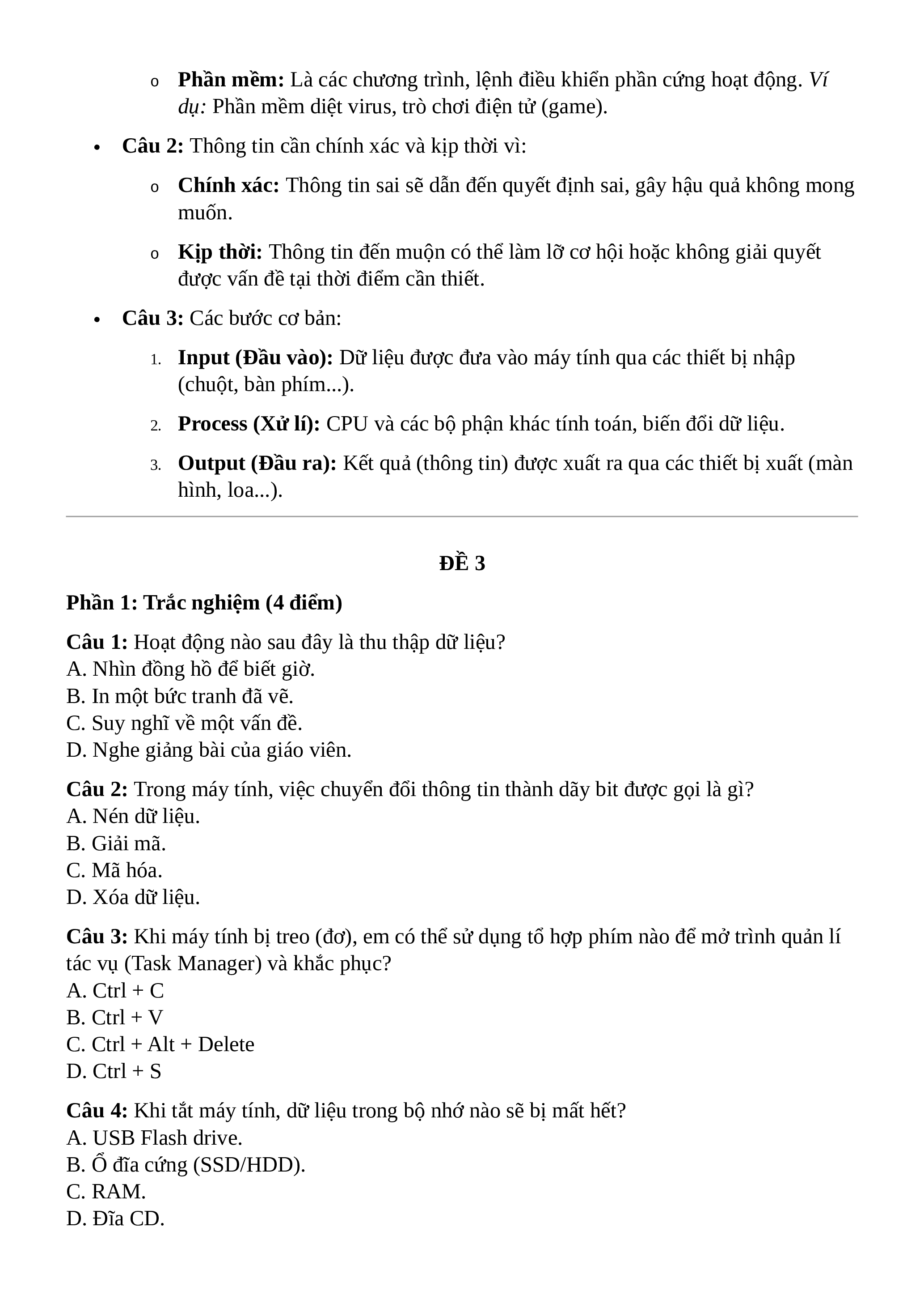 Câu 3 (2 điểm): Nêu các bước cơ bản để máy tính xử lí dữ liệu (Input -> Process -> Output)?