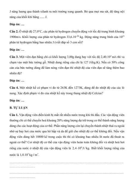 Câu 6. Nếu thực hiện công 100 J để nén khí trong một xilanh thì khí truyền ra môi trường