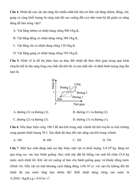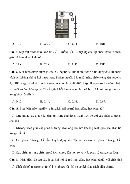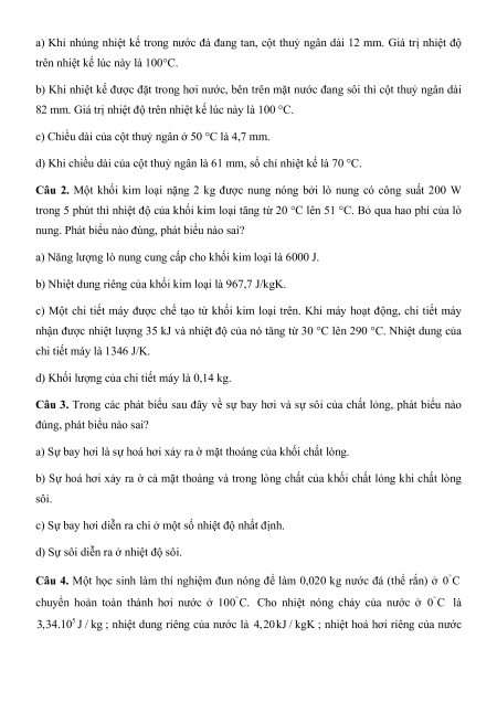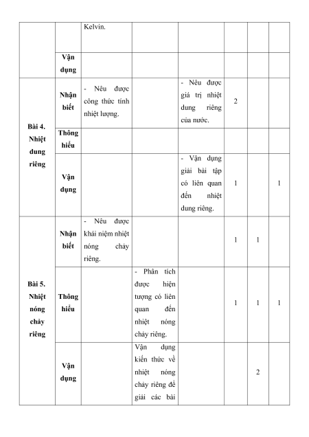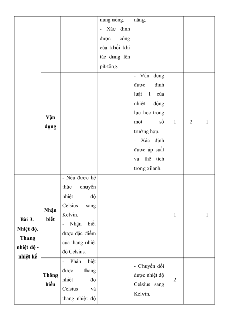 hệ thức của được độ biến 1 2 hiểu học khối khí bị thiên nội nung nóng. năng. - Xác định được công của khối khí tác dụng lên pít-tông. - Vận dụng được định luật I của nhiệt động lực học trong Vận một số 1 2 1 dụng trường hợp. - Xác định được áp suất và thể tích trong xilanh. - Nêu được hệ thức chuyển nhiệt độ Celsius sang Nhận Kelvin. 1 1 Bài 3. biết - Nhận biết Nhiệt độ. được đặc điểm Thang của thang nhiệt nhiệt độ - độ Celsius. nhiệt kế - Phân biệt - Chuyển đổi được thang Thông được nhiệt độ nhiệt độ 2 hiểu Celsius sang Celsius và Kelvin. thang nhiệt độ Kelvin. Vận dụng - Nêu được - Nêu được Nhận giá trị nhiệt công thức tính 2 biết dung riêng nhiệt lượng. của nước. Bài 4. Thông Nhiệt hiểu dung - Vận dụng riêng giải bài tập Vận có liên quan 1 1 dụng đến nhiệt dung riêng. - Nêu được