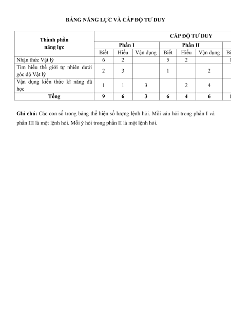 BẢNG NĂNG LỰC VÀ CẤP ĐỘ TƯ DUY CẤP ĐỘ TƯ DUY Thành phần năng lực Phần I Phần II Phần III Biết Hiểu Vận dụng Biết Hiểu Vận dụng Biết Nhận thức Vật lý 6 2 5 2 1