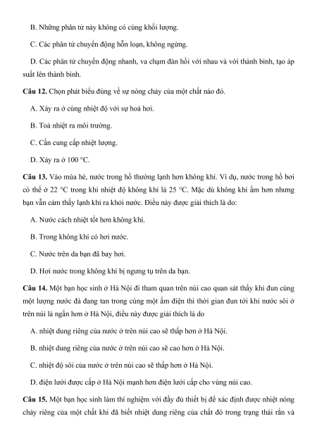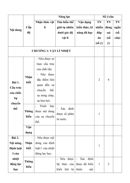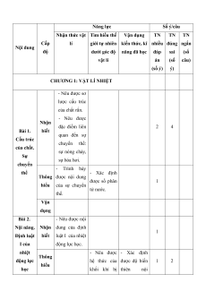 CHƯƠNG 1: VẬT LÍ NHIỆT - Nêu được sơ lược cấu trúc của chất rắn. - Nêu được Nhận đặc điểm liên 2 4 Bài 1. biết quan đến sự Cấu trúc chuyển thể: của chất. sự nóng chảy, Sự sự hóa hơi. chuyển - Trình bày thể - Xác định