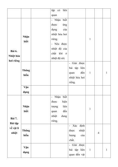 Nhận khái niệm nhiệt 1 1 biết nóng chảy riêng. - Phân tích Bài 5. được hiện Nhiệt Thông tượng có liên 1 1 1 nóng hiểu quan đến chảy nhiệt nóng riêng chảy riêng. Vận dụng kiến thức về Vận nhiệt nóng 2 dụng chảy riêng để giải các bài