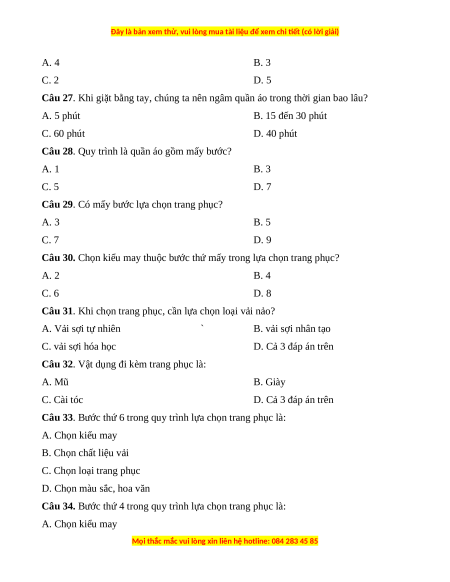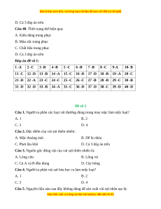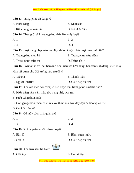 Câu 20. Sử dụng trang phục có chất liệu vải dễ thấm mồ hôi khi: A. Đi học B. Đi chơi C. Đi lao động D. Đi lễ hội