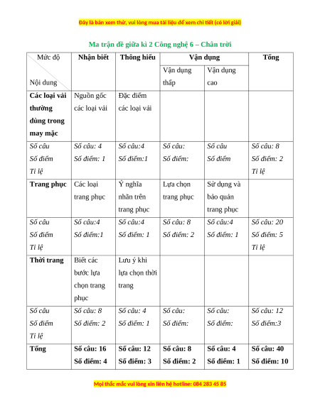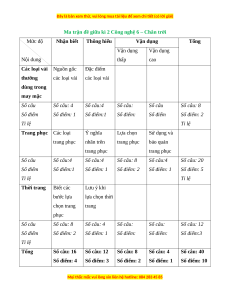 Trang phục Các loại Ý nghĩa Lựa chọn Sử dụng và trang phục nhãn trên trang phục bảo quản trang phục trang phục Số câu Số câu:4 Số câu:4 Số câu: 8 Số câu:4 Số câu: 20 Số điểm Số điểm:1 Số điểm: 1 Số điểm: 2 Số điểm: 1 Số điểm: 5 Tỉ lệ Tỉ lệ Thời trang Biết các Lưu ý khi bước lựa lựa chọn thời chọn trang trang phục Số câu Số câu: 8 Số câu: 4 Số câu: Số câu: Số câu: 12 Số điểm Số điểm: 2 Số điểm: 1 Số điểm: Số điểm: Số điểm:3 Tỉ lệ Tổng Số câu: 16 Số câu: 12 Số câu: 8 Số câu: 4 Số câu: 40 Số điểm: 4 Số điểm: 3 Số điểm: 2 Số điểm: 1 Số điểm: 10