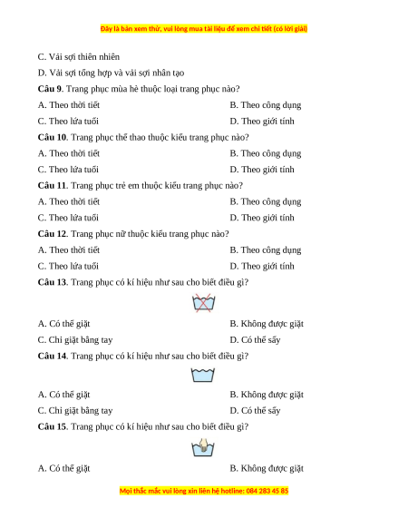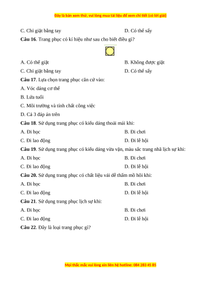Câu 15. Trang phục có kí hiệu như sau cho biết điều gì? A. Có thể giặt B. Không được giặt