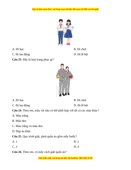 Câu 21. Sử dụng trang phục lịch sự khi: A. Đi học B. Đi chơi C. Đi lao động D. Đi lễ hội