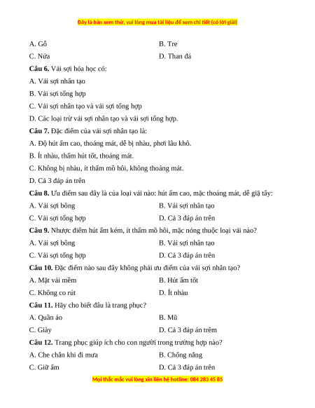 Câu 4. Vải sợi thiên nhiên có nguồn gốc thực vật là: A. Vải tơ tằm B. Vải bông C. Vải len D. Cả 3 đáp án trên