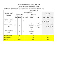 (2 lệnh hỏi - (2 lệnh hỏi - đổi (0,5đ) (1,0đ) 0,25đ) 0,75đ) 1 Tiêu dùng thông 4 1 3 (4 lệnh hỏi - minh 1,0đ) Tổng số câu hỏi 20 2 2 Tổng số điểm 5,0 2,0 3,0 Tỉ lệ (%) 50% 20% 30%