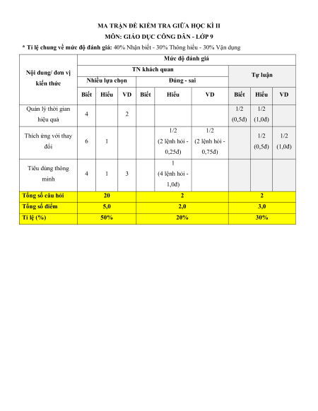 * Tỉ lệ chung về mức độ đánh giá: 40% Nhận biết - 30% Thông hiểu - 30% Vận dụng Mức độ đánh giá Nội dung/ đơn vị TN khách quan Tự luận kiến thức Nhiều lựa chọn Đúng - sai Biết Hiểu VD Biết Hiểu VD Biết Hiểu VD Quản lý thời gian 1/2 1/2 4 2 hiệu quả (0,5đ) (1,0đ) 1/2 1/2 Thích ứng với thay 1/2 1/2 6 1