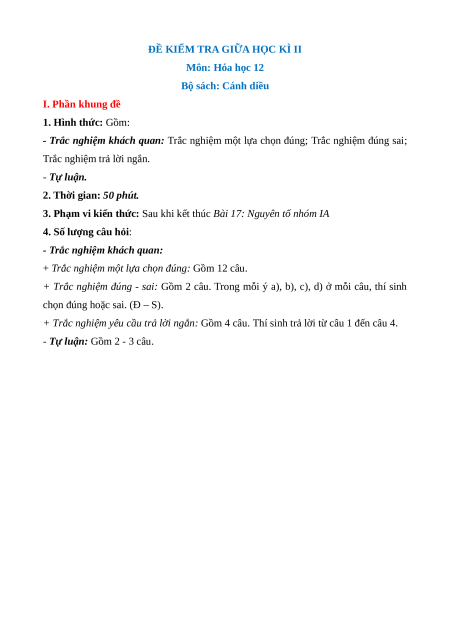 - Tailieugiaovien.com.vn giới thiệu bộ 3 đề giữa kì 2 gồm đầy đủ ma trận và lời giải chi tiết môn Hóa học 12 Cánh diều mới nhất năm 2025 nhằm giúp Giáo viên có thêm tài liệu tham khảo ra đề thi Hóa học 12.