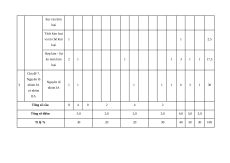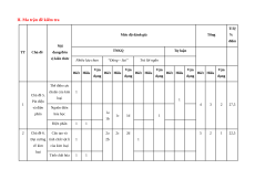 II. Ma trận đề kiểm tra Tỉ lệ Mức độ đánh giá Tổng % điểm Nội TT Chủ đề dung/đơn TNKQ Tự luận vị kiến thức Nhiều lựa chọn “Đúng – Sai” Trả lời ngắn Vận Vận Vận Vận Vận Biết Hiểu Biết Hiểu Biết Hiểu Biết Hiểu Biết Hiểu dụng dụng dụng dụng dụng Thế điện cực chuẩn của kim 1 Chủ đề 5. loại Pin điện 1 1 4 3 2 27,5 và điện Nguồn điện phân hóa học 1a 1c 1d 1 1b Điện phân 1 1 2 Chủ đề 6. Cấu tạo và 2a 2c 2d 5 2 1 22,5